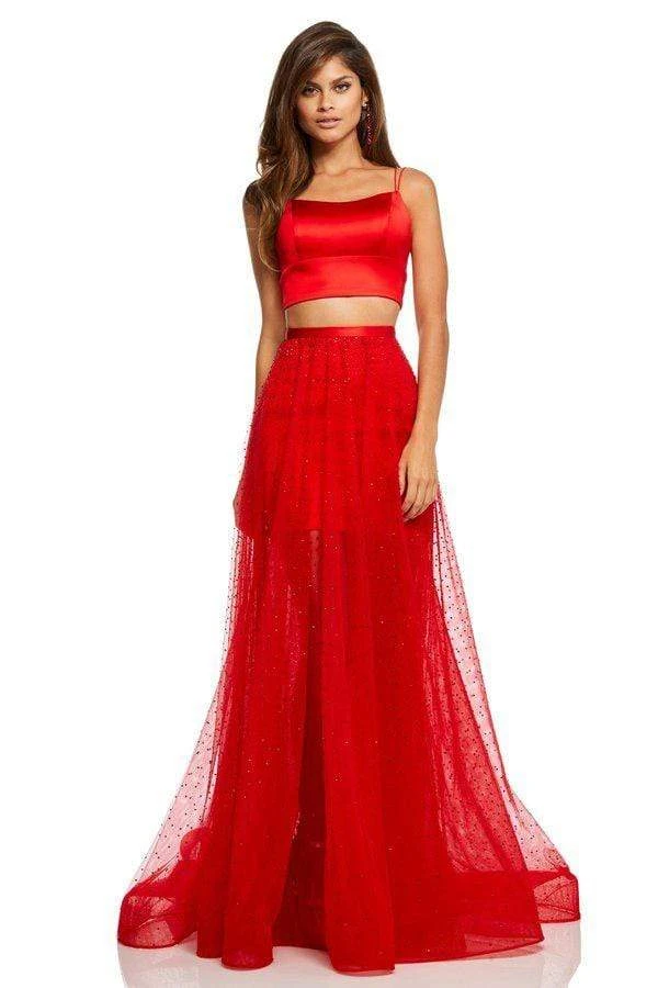 Enter the party and do that walk of a regal beauty in Sherri Hill 52749. This two piece dress pleases in a sleeveless, scoop neckline with crop top styled with a lace up back. The chiffon skirt flourishes full length A-line silhouette and finishes in a sweep train. You are a breath of fresh air in this dreamy Sherri Hill look.