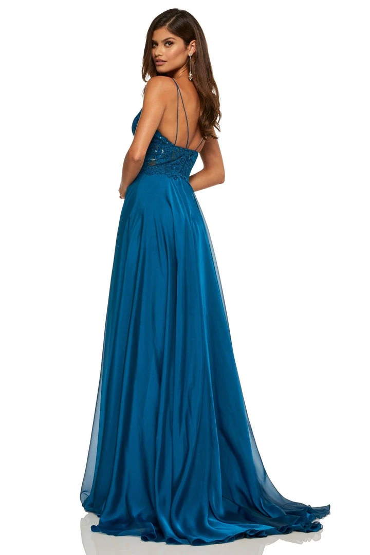 Impress everyone with the fascinating elegance of this Sherri Hill 52818 creation. Adorned with lace appliques crusting the bust while boasting the sheer bodice, this piece flatters with a deep v-neckline and mid-open back. The lush A-line skirt softly cascades into a full-length hemline and a train. Astound everyone with the pure femininity of this Sherri Hill masterpiece. Models are wearing the Dreamcicle and Peacock colors.
