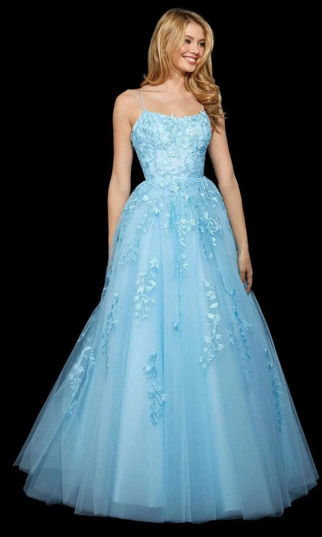 Get noticed in this radiant dress by Sherri Hill 53116. Floral lace embroidery overlays this sleeveless gown, featuring a slim ballgown silhouette with a modest scoop neckline with dual spaghetti straps and a corset lace-up back. This beautiful ensemble finishes with a multi-layered skirt that cascades to a brush train. Make it a romantic occasion with this creation by Sherri Hill. Find more formal dresses!