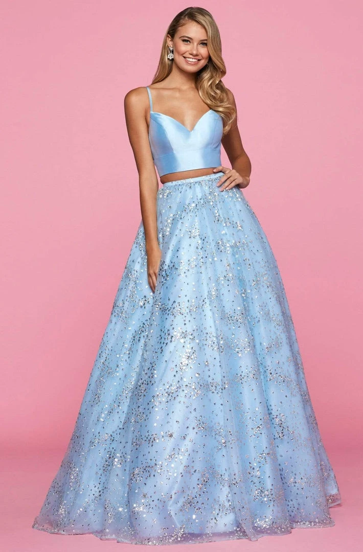 Beam with pride when you wear this radiant Sherri Hill 53326. This masterpiece is tailored with a sweetheart neckline, slim straps, crop Mikado bodice, lace-up open back, and a zipper closure. The skirt is styled in an A-line silhouette, glitter detailing, and a sweep train. Breeze through your special day while making a stylish statement in this Sherri Hill masterpiece. Model is wearing light blue and navy.