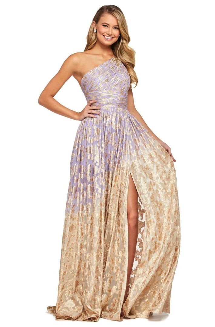 Be one of the best dressed lists as you show up in this Sherri Hill 53376 masterpiece. Designed in cross dyed metallic print, this ensemble showcases a ruched bodice with an asymmetrical neckline and singe shoulder strap. The waist is accented with a wide cummerbund band giving way to the a-line skirt with wrap front and side slit. The back displays beaded straps and sweep train for added drama. Walk in a defined sophistication and beauty wearing this Sherri Hill creation. Model is wearing Lilac/Gold color.