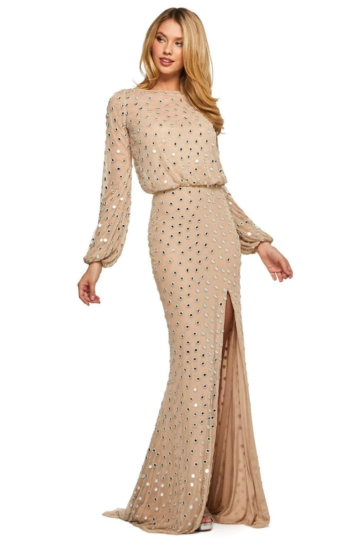 Make yourself into a vision of loveliness in this spectacular full-length gown by Sherri Hill 53491. Featuring a blouson top, this masterpiece features bateau neckline, shisha embroidery, bishop sleeves, and a keyhole back. The skirt is in a sheath silhouette featuring a high-leg slit, and a sweep train. A stunning choice for prom, semi formals or any occasion.