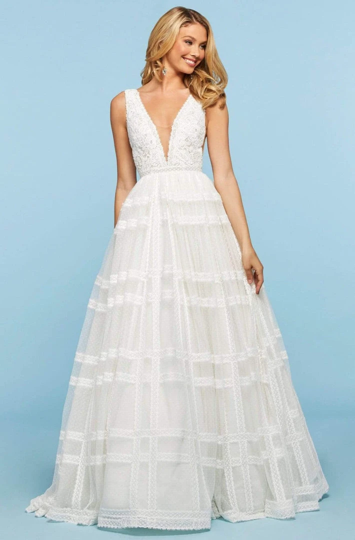 | Details: | Plunging V-Neckline with Mesh, Fitted Lace Bodice, Open V-Back, Zipper Closure, A-Line Silhouette |