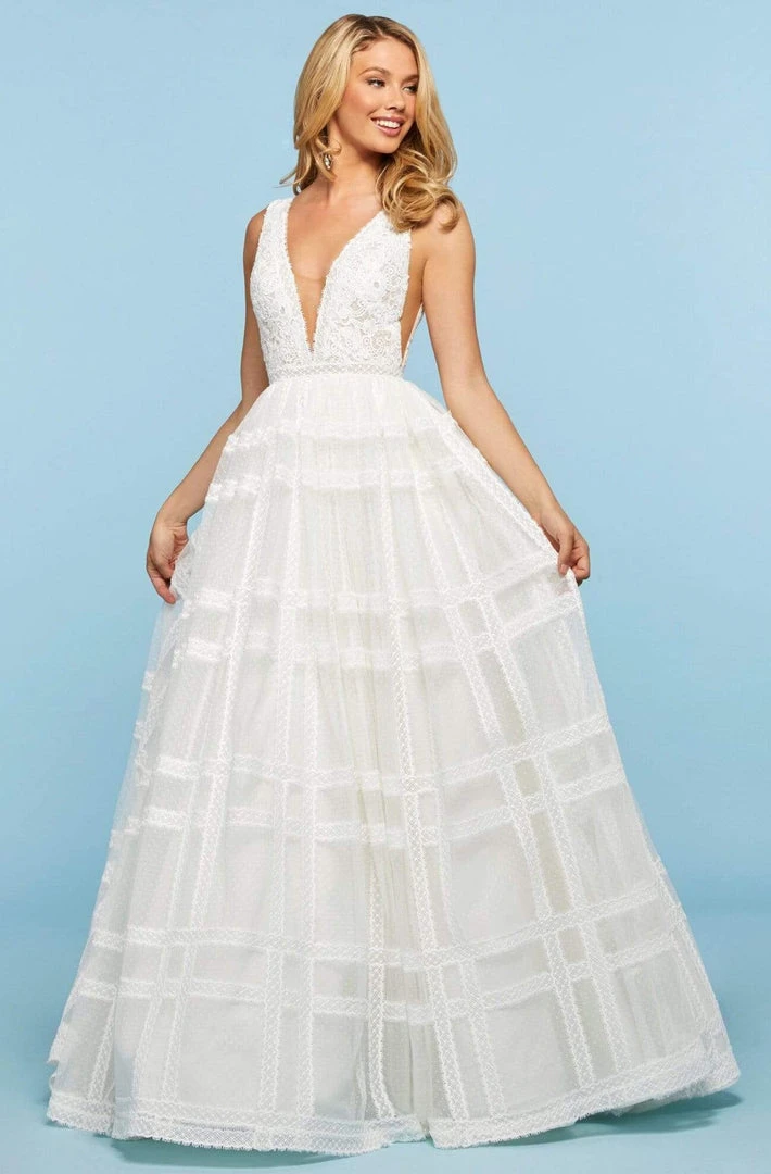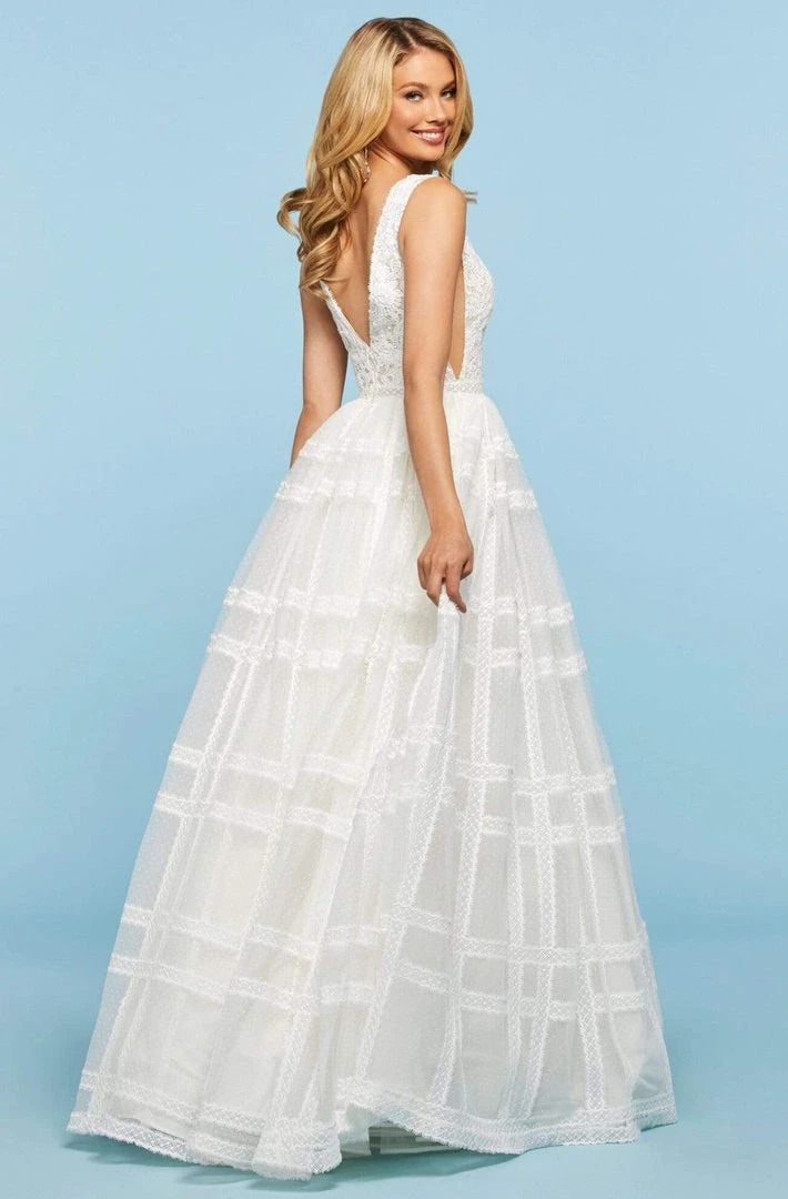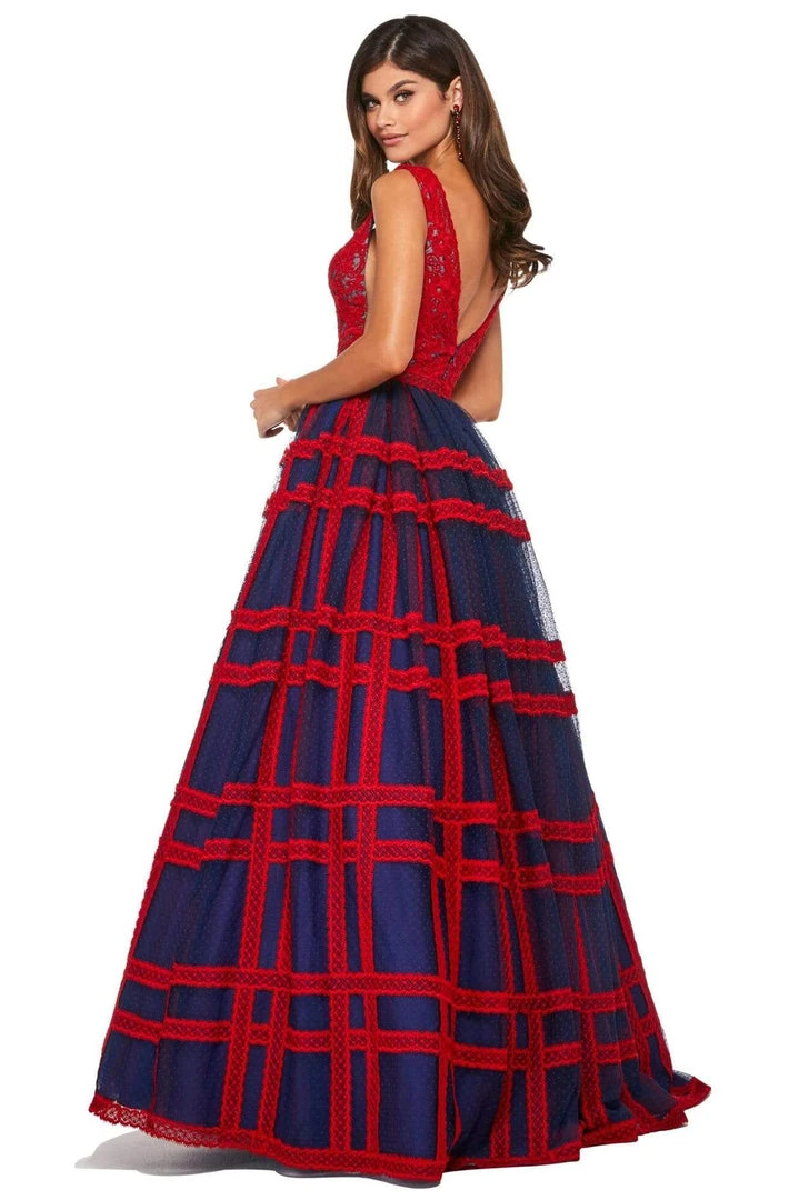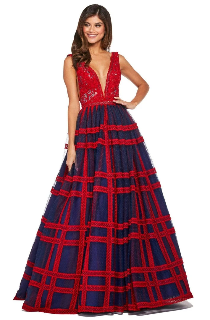Dare to bare in this decadent Sherri Hill 53505. This sleeveless stunner features a plunging V-neckline with mesh, fitted lace bodice, open V-back and a zipper closure. The skirt is in an A-line silhouette, completing the look. You’ll look fantastic in photos with a beautiful gown from Sherri Hill. Model is wearing white and red and blue.