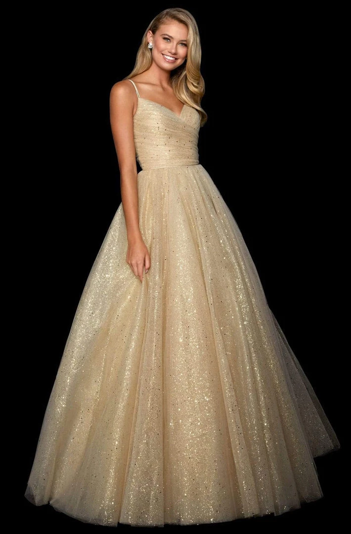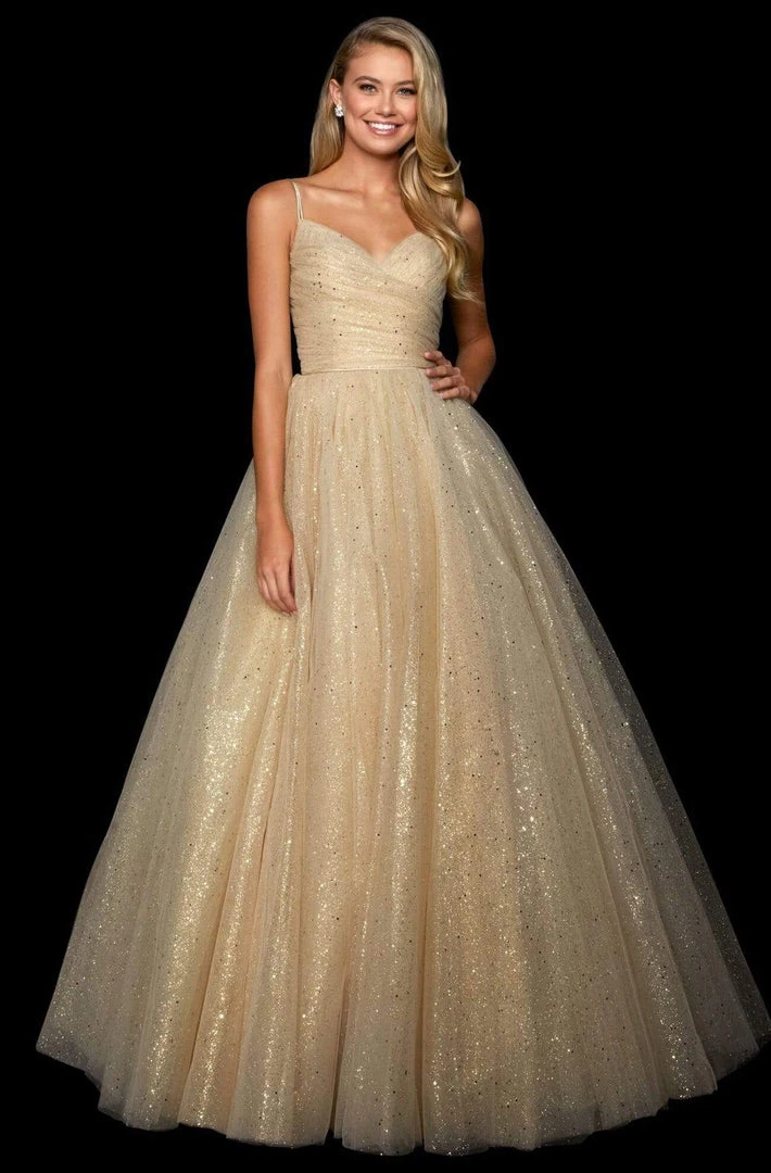 | Details: | Sweetheart Neckline, Ruched Bodice, Dual Straps, Lace-Up Open Back, A-Line Silhouette, Glitter Detailing |