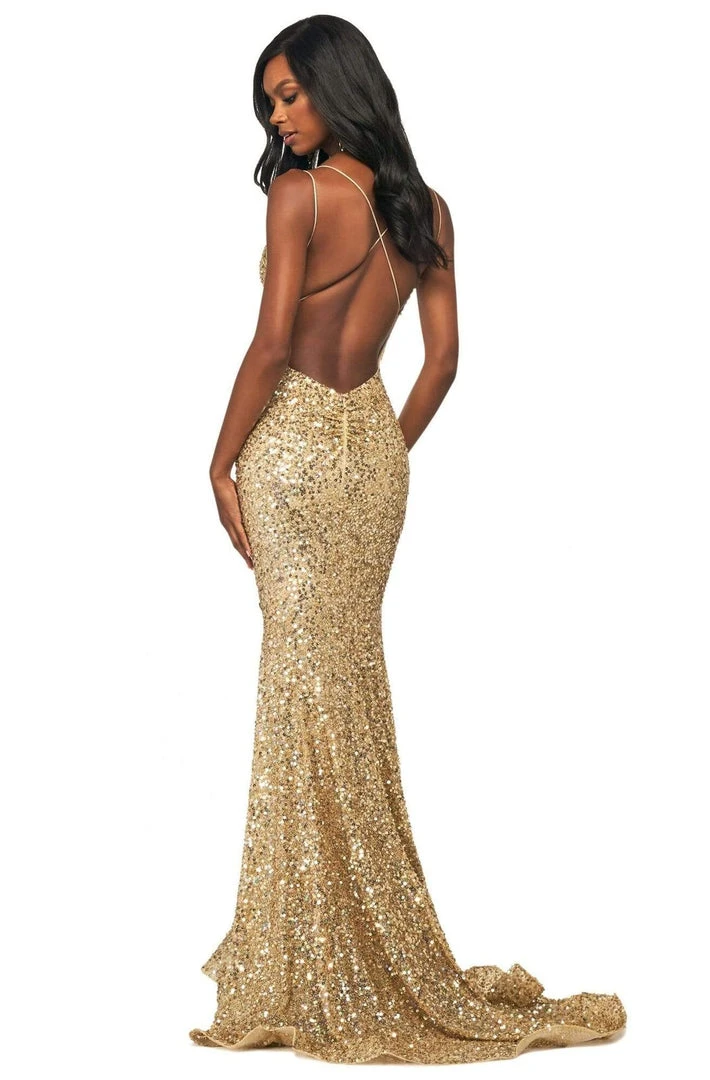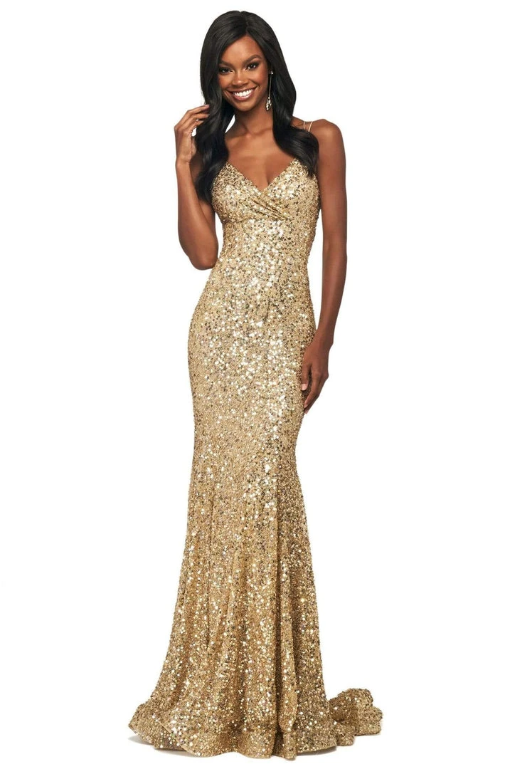 Enhance your visual appeal in this luxurious Sherri Hill 53817. This sleeveless sparkling beauty features plunging V-neckline, adorned with sequin detailing all over, ruching in the chest, dual straps extending to the open back, and a zipper closure. The sheath silhouette skirt features horsehair hemline, and a sweep train. Flatter your shape with a sculpted gown from Sherri Hill. Model is wearing gold.