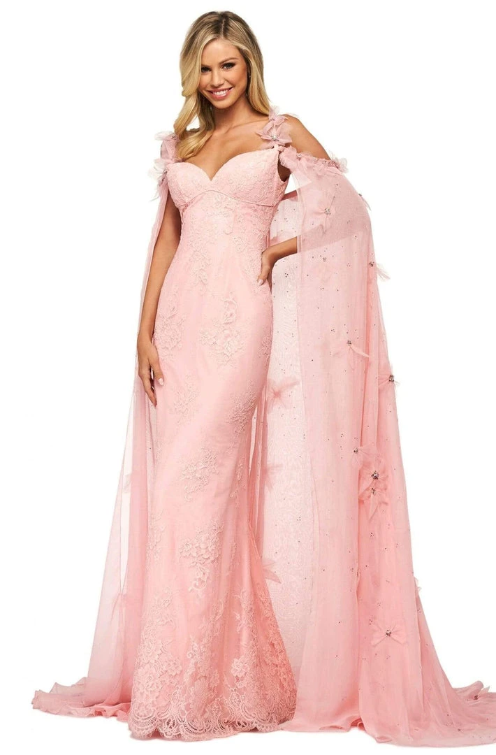 Make it your night worth reminiscing in this decadent Sherri Hill 53822. Gracing with a sweetheart neckline, this masterpiece is adorned with embroidery and flower appliques, stone accent, scoop back and a zipper closure. The skirt is in a sheath silhouette with lace hemline, and followed by an organza cape with Watteau train. This Sherri Hill is an instant refresh for your eveningwear repertoire. Model is wearing pink.
