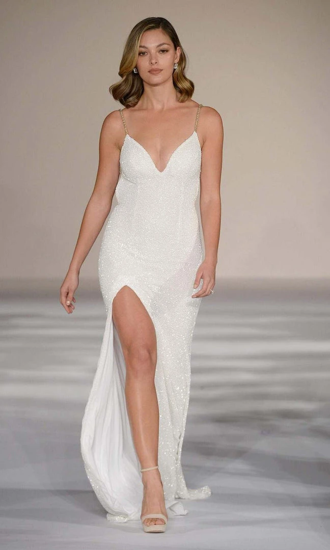 | Details: | Sleeveless, Spaghetti straps, Fitted bodice, Plunging neckline, Butterfly back, Back zipper, Floor length |