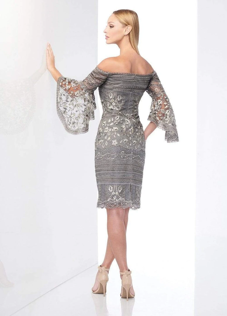 Perfectly on-trend yet still unique, this off-the-shoulder allover embroidered lace with below-the-knee sheath is embellished with hot stones, and offers three-quarter length illusion lace bell sleeves and a center back slit.