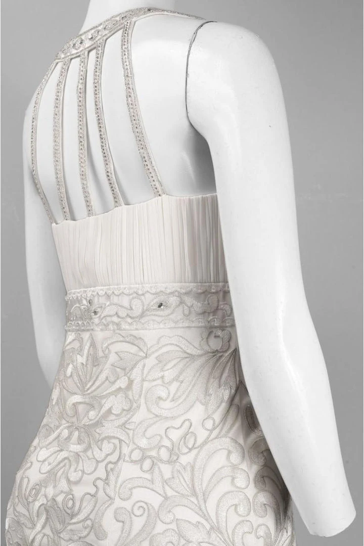 | Details: | Sleeveless, Beaded Neckline and Waist, Ruched Bodice, Embroidered Skirt, Front Keyhole, Back Multi Straps |