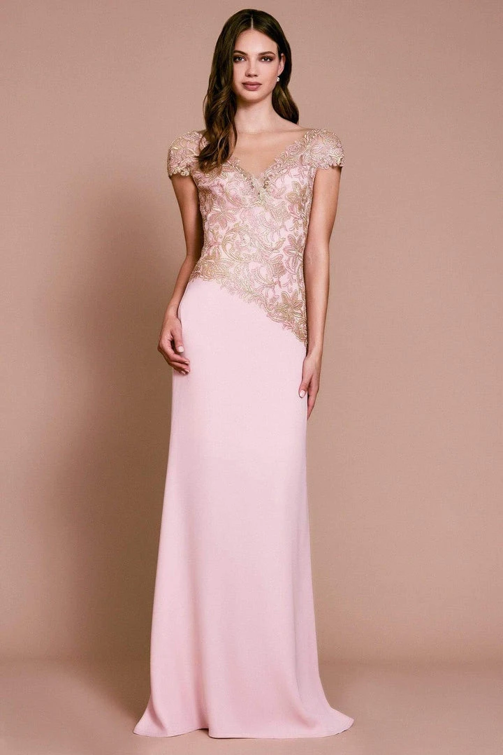 Embroidery embellished with metallic cording, a deep V-neckline with tulle illusion, and a floor-length, modified crepe style an effortless evening gown brimming with sartorial elegance.
