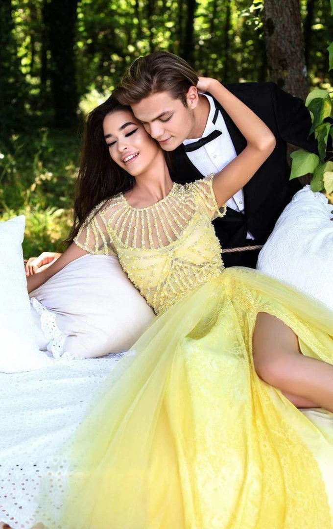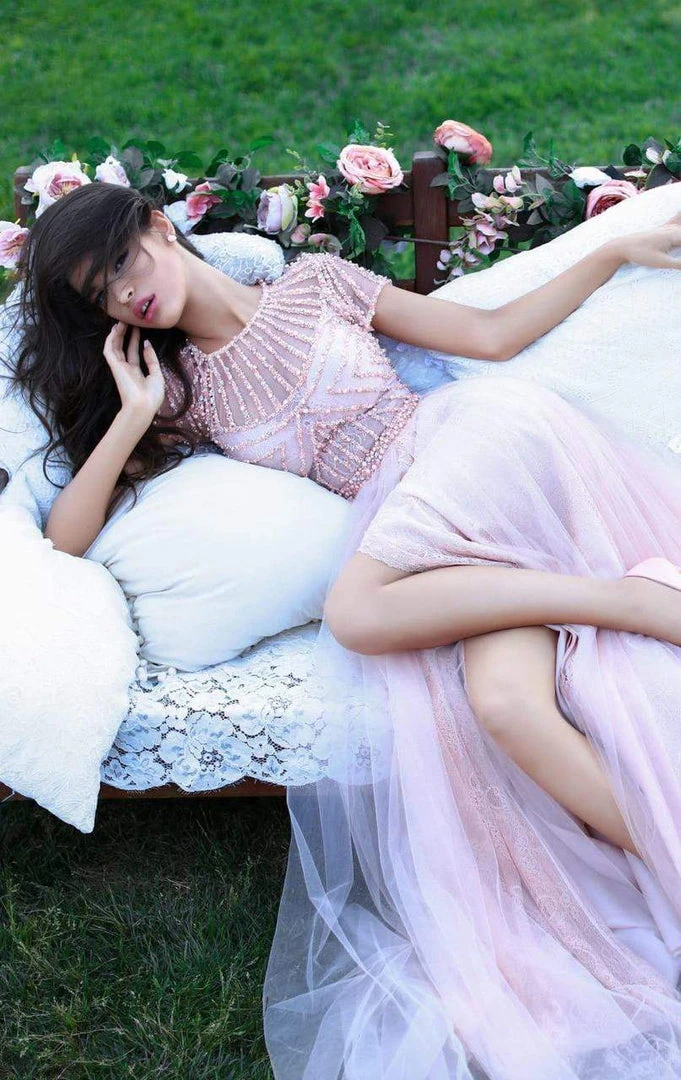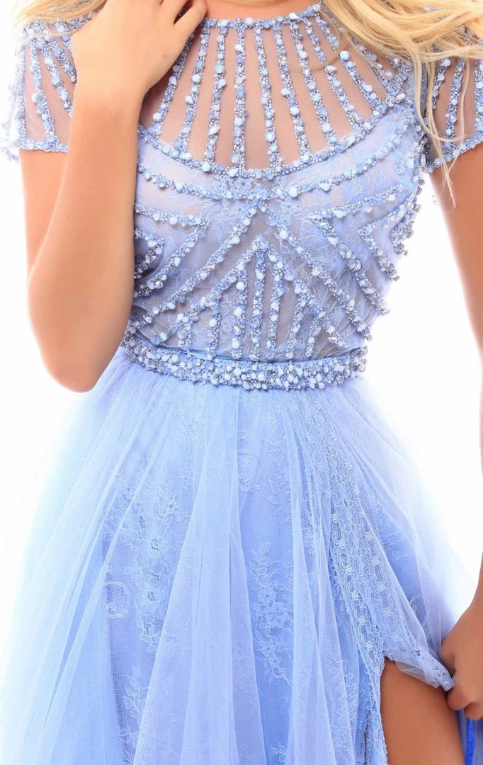 | Details: | Tulle, Beaded Lace Bodice, Illusion Neckline and Short Sleeves, Beaded Waistband, Tulle over Lace Skirt, Floor Length, Pleated, Side Slit, Sheer Full Back |