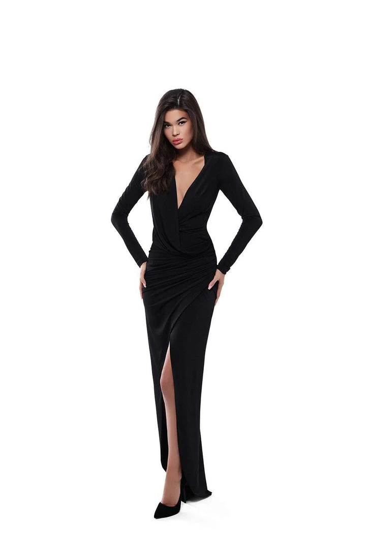 Wrap yourself in pure elegance while looking like a statuesque beauty in this Tarik Ediz 50529 creation. Parading loose draping and subtle ruching on a jersey fabric, this chic piece proposes a plunging v-neckline with slender long sleeves. Gathered at one side in a wrap-style design, the sheath skirt exposes those lovely legs with a high slit that falls in a full-length hemline. Mesmerize the crowd with your eloquent style in this Tarik Ediz masterpiece. Model is wearing the Black color.
