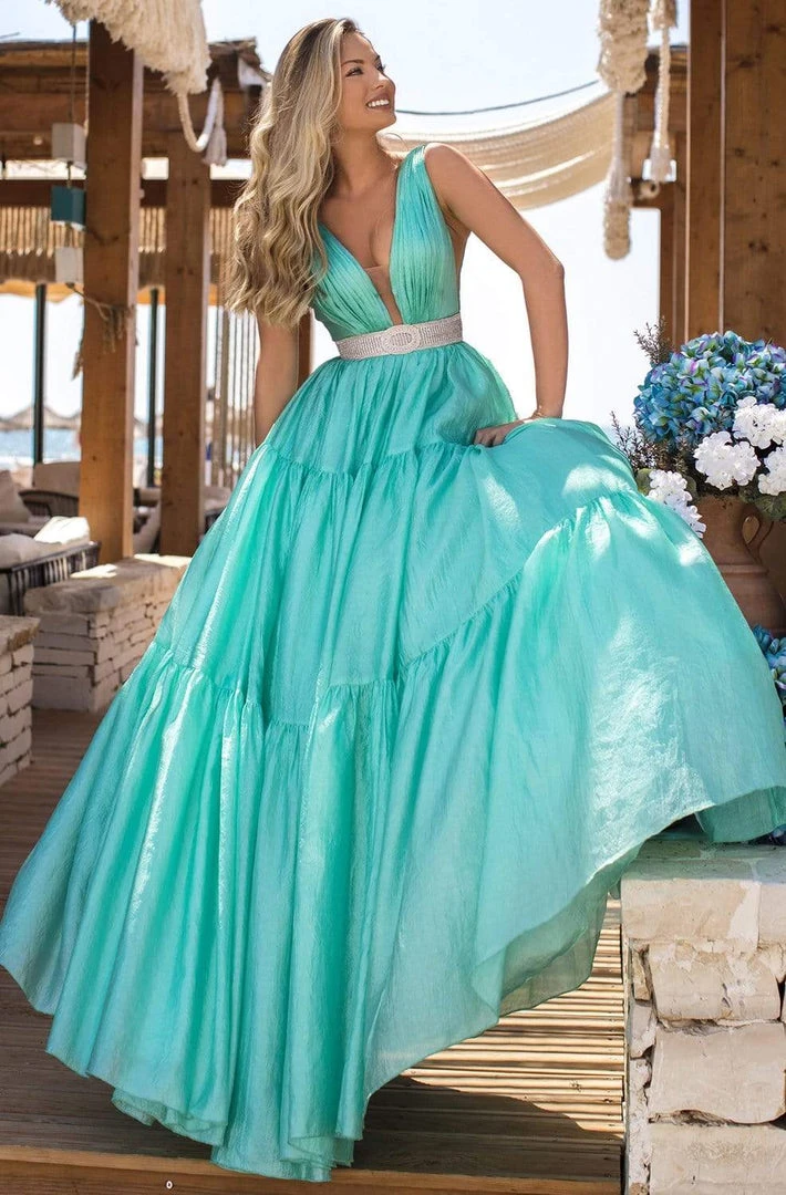 Look utterly regal when you glide with mesmerizing flair in this exceptional Tarik Ediz 50642 creation. Vibrant in solid organza with finely ruched V bodice and gleaming waistband on the natural waist, this fabulous piece a plunging neckline and v cut-out panel with a shrouding illusion inset. The voluminous shirred ballgown skirt cascades glamorously down to a full-length hemline. Live the dream of being the belle of the ball in this picture-perfect Tarik Ediz masterpiece.
