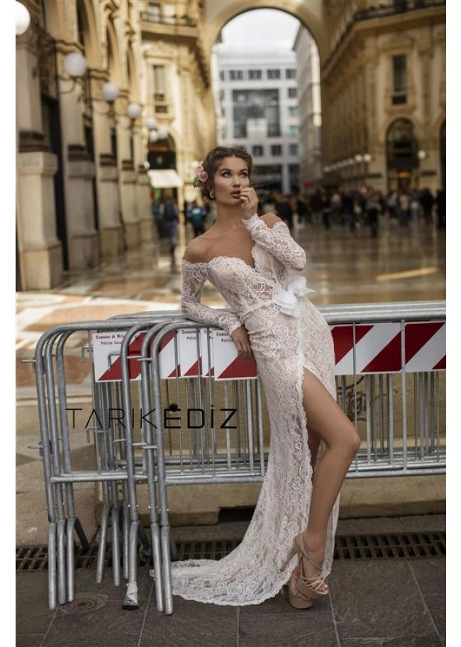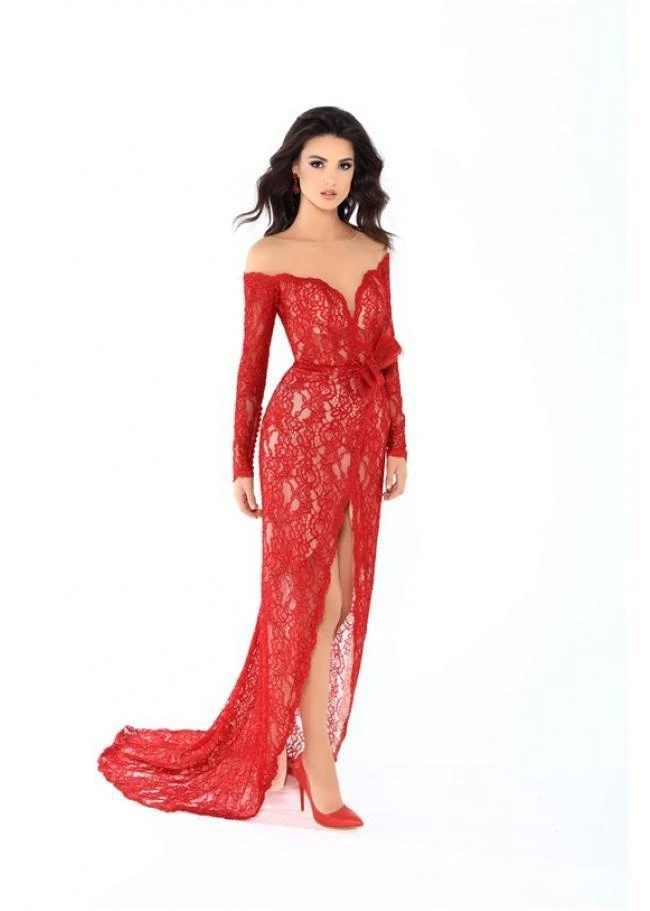 Appear in elegance and get ready to fascinate everyonesen you walk on the red carpet in Tarik Ediz 93625. This classy evening dress is fashioned in full length Lace overlay with an illusion off shoulder neckline, sweetheart shaped bustline and slender long sleeves. A bow accent on the natural waistline enhances the feminine touch of this romantic dress. The surplice style fitted bodice splits at mid-thigh drawing a long slit on the skirt, that goes down to the floor length and finishes with back sweep train. Turn heads instantly and leave everyoneseathless in this enchantingly designed Tarik Ediz evening dress.