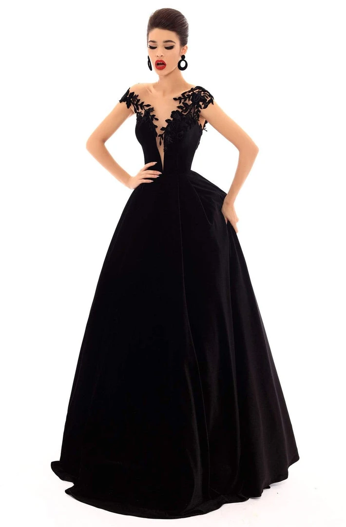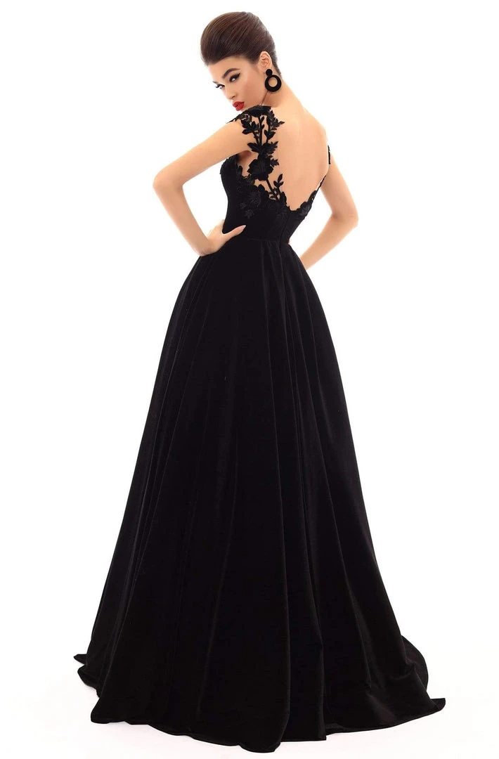 Look amazing in this velvet gown by Tarik Ediz 93697. Features an illusion neckline with cap sleeves. Floral appliques style the plunging V-lined fitted bodice. The back has a low V-cut and from the waist opens a full-length ballgown skirt wit isweep train finish. Wow everyones this sophisticated gown by Tarik Ediz. Model is wearing Black color.