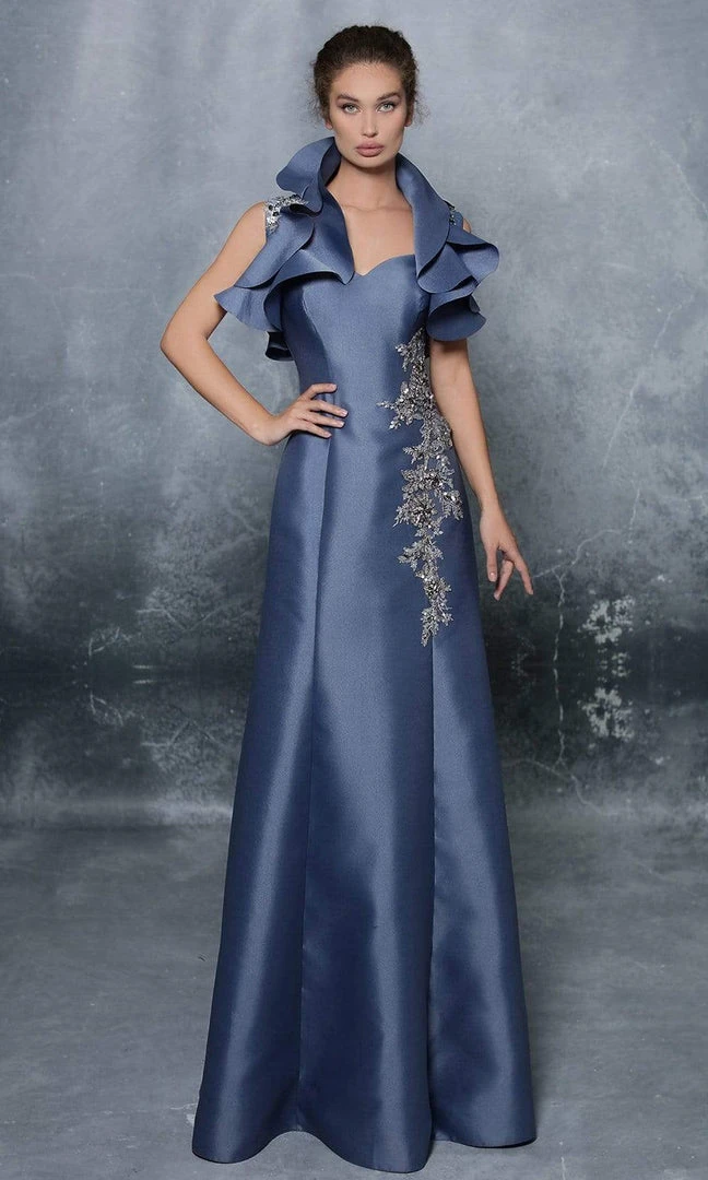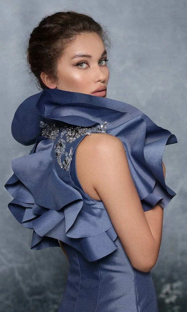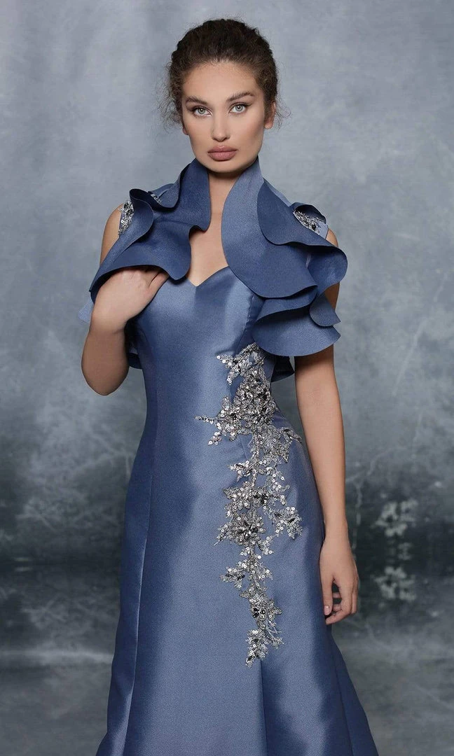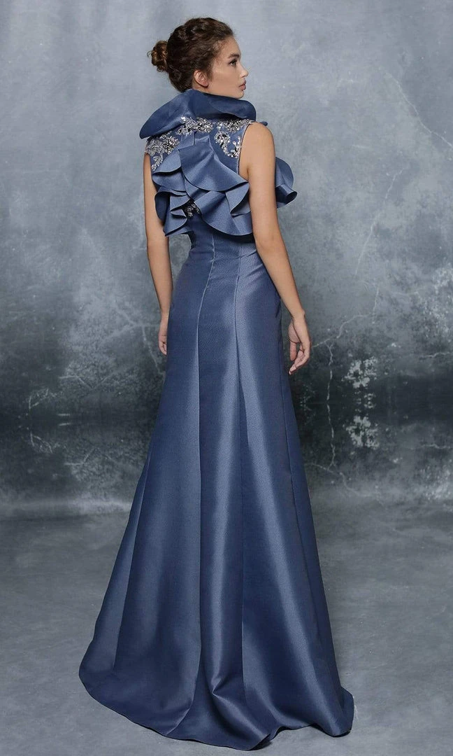 Mesmerizes in a sleeveless, ruffled Queen Anne neckline with a sweetheart notch. The skirt is tailored in a full length A-line silhouette with a train finish. Model is wearing Marlin Blue color.