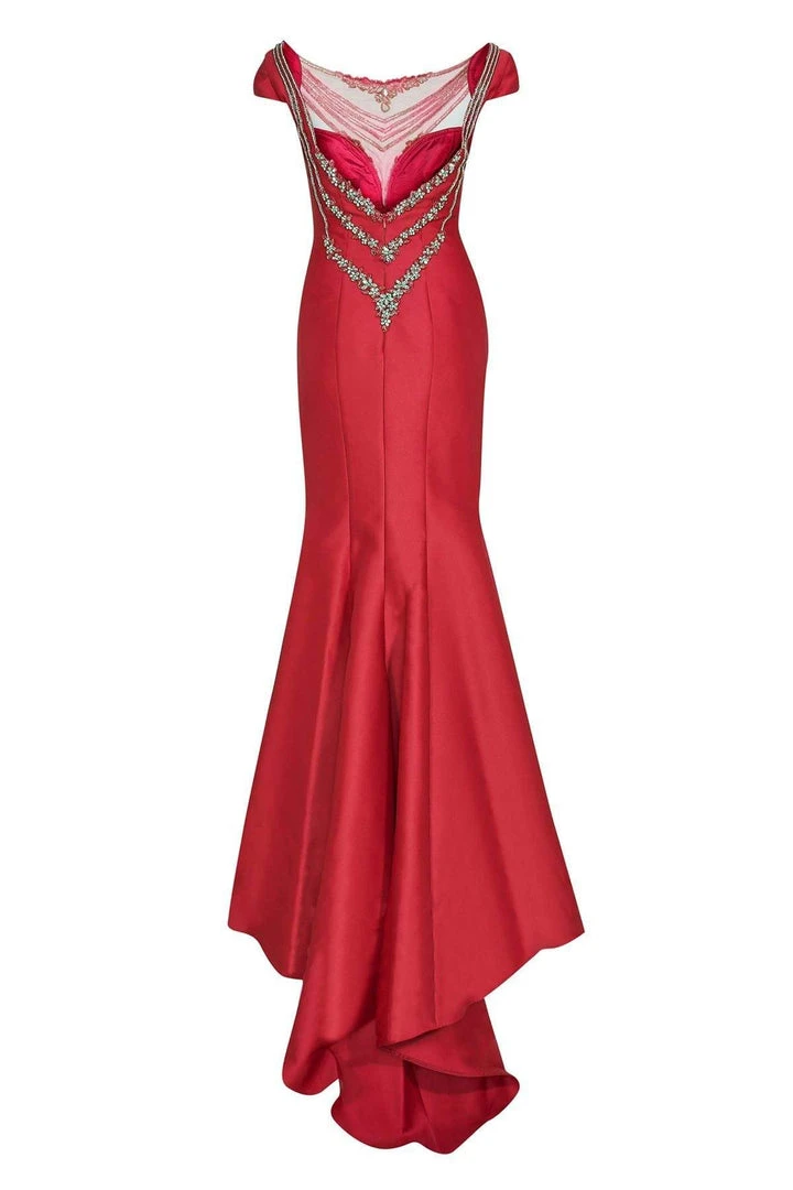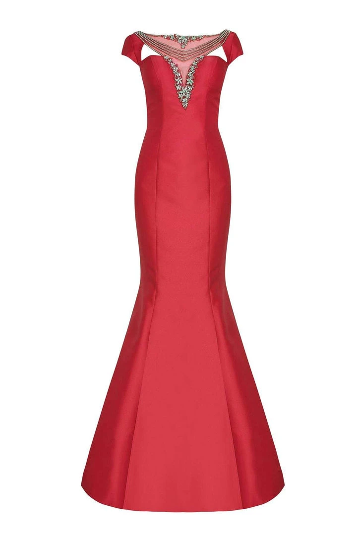 Be the spotlight wearing this extravagant gown by Tarik Ediz 50019. Glittering crystals highlight the sheer, bateau neckline. Petite floral accents bedeck the plunge at center front while couture lines define an iconic silhouette. The slim skirt flutes to a floor-brushing d??nouement. Be in this gorgeous Tarik Ediz creation and leave a lasting impression. Model is wearing Black color.