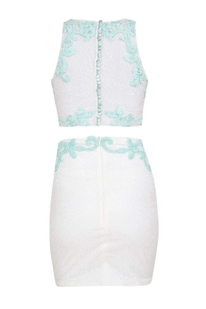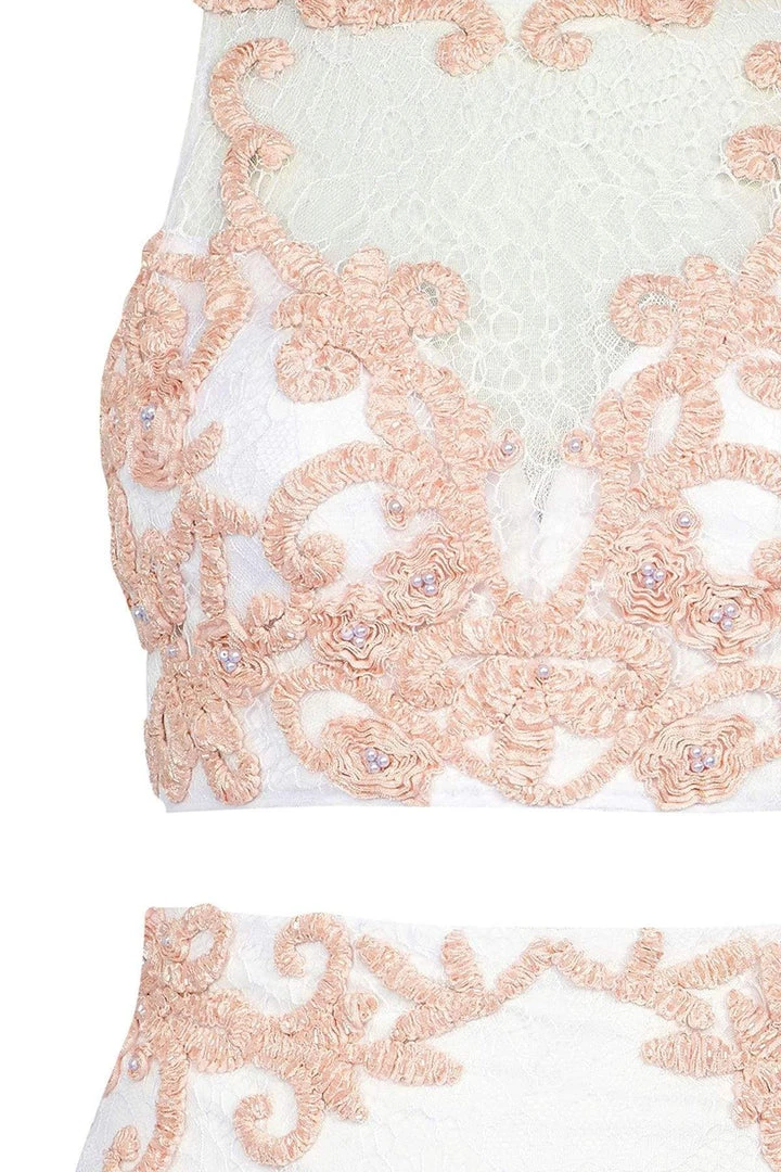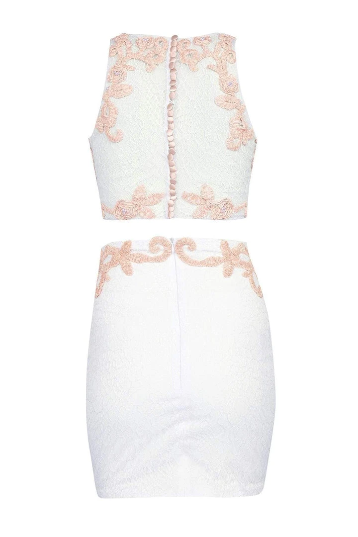 Draw out the princess in you with this dress by Tarik Ediz 90443. This two-piece cocktail dress showcases a halter neckline. Contrasting lace applique adorns the sheer fabric over sweetheart lining. The fit ishort skirt is crowned with more lace applique giving accents to your gorgeous look. Be pretty in this Tarik Ediz dress! Model is wearing Yellow dress.
