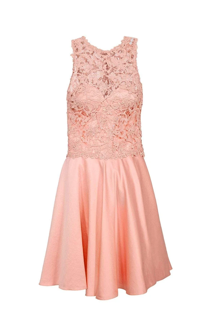 | Details: | Sheer lace overlay, Sleeveless, Bow accented back, Short hem |