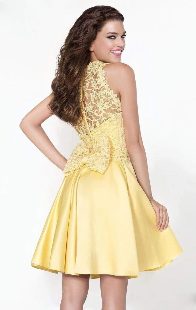 Wow everyone in this sophisticated dress by Tarik Ediz 90419. This eye-catching cocktail dress features a strapless and sweetheart neckline. Sheer lace overlay is trimmed with scoop and sleeveless neckline, emphasized with large bow detailing at the back. With a mid-thigh length skirt, this dress is sure to make you feel and look beautiful all night long. This dress can be worn with or without the top overlay. This dress by Tarik Ediz will make you feel all royal and radiant looking. Model is wearing Yellow color.