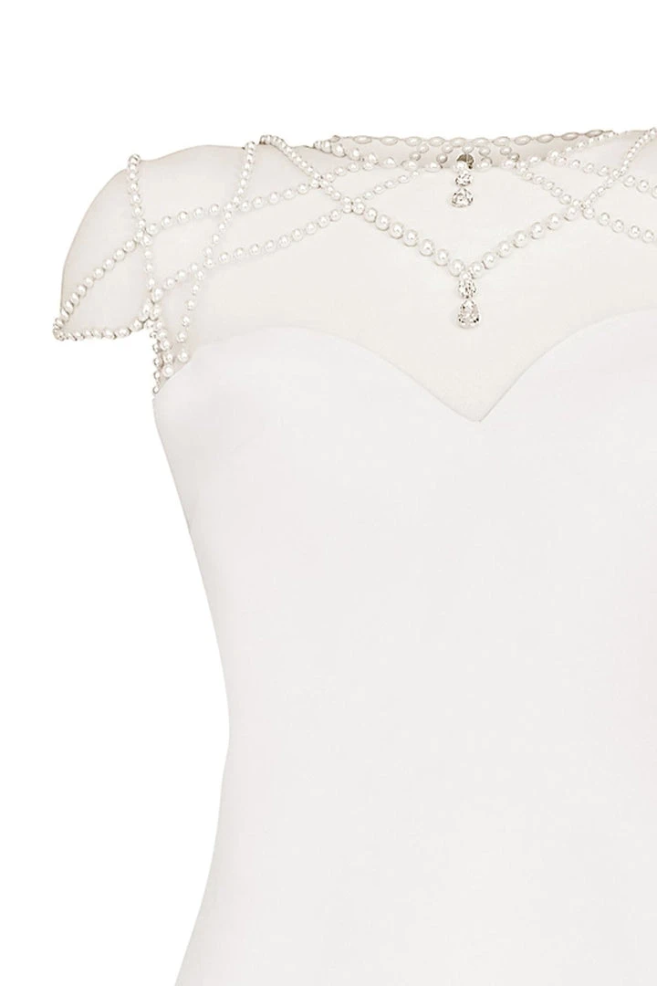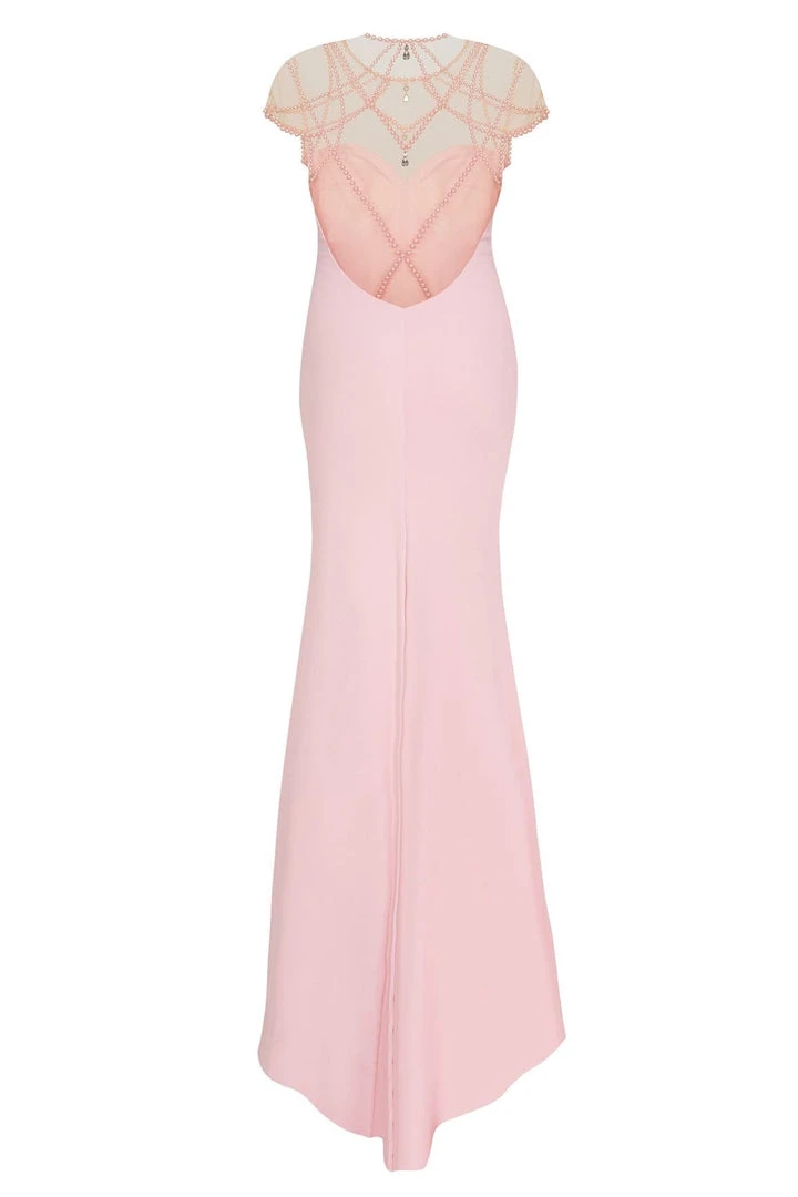 | Details: | Cap sleeves, Sheer fabric, Pearl accents, Sweetheart lining, Fitted bodice, Trumpet skirt, Sweep train |