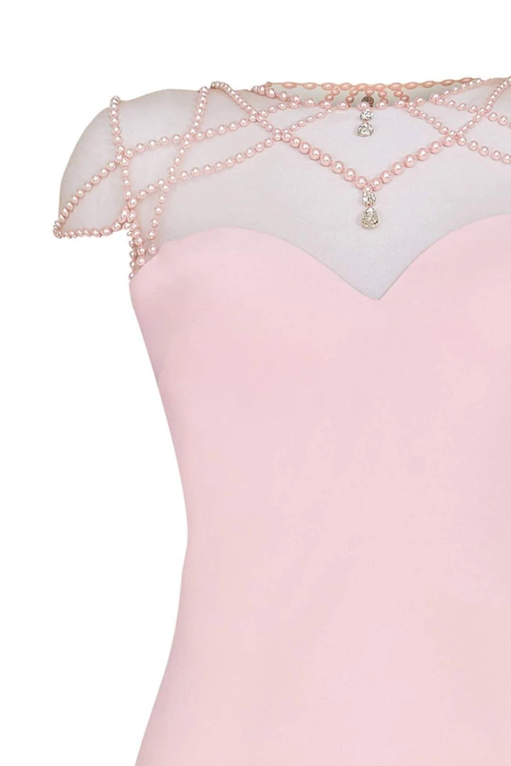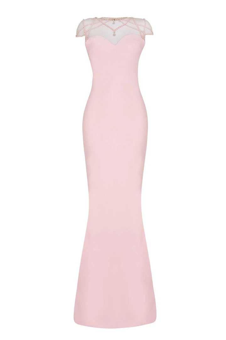 Claim your spot as the darling of the ball with this stunningly piece by Tarik Ediz 50098. The illusion jewel neckline bodice has timeless cap sleeves and a sweetheart lining that shape your curves. Draped in shimmering tonal pearl strands for a lavish and sophisticated style, this slim fitting ensemble slides to the full-length fishtail hem, finished with a decadent sweep train. Make yourself into a vision of loveliness in this spectacular full length dress by Tarik Ediz. Model is wearing Blue color.