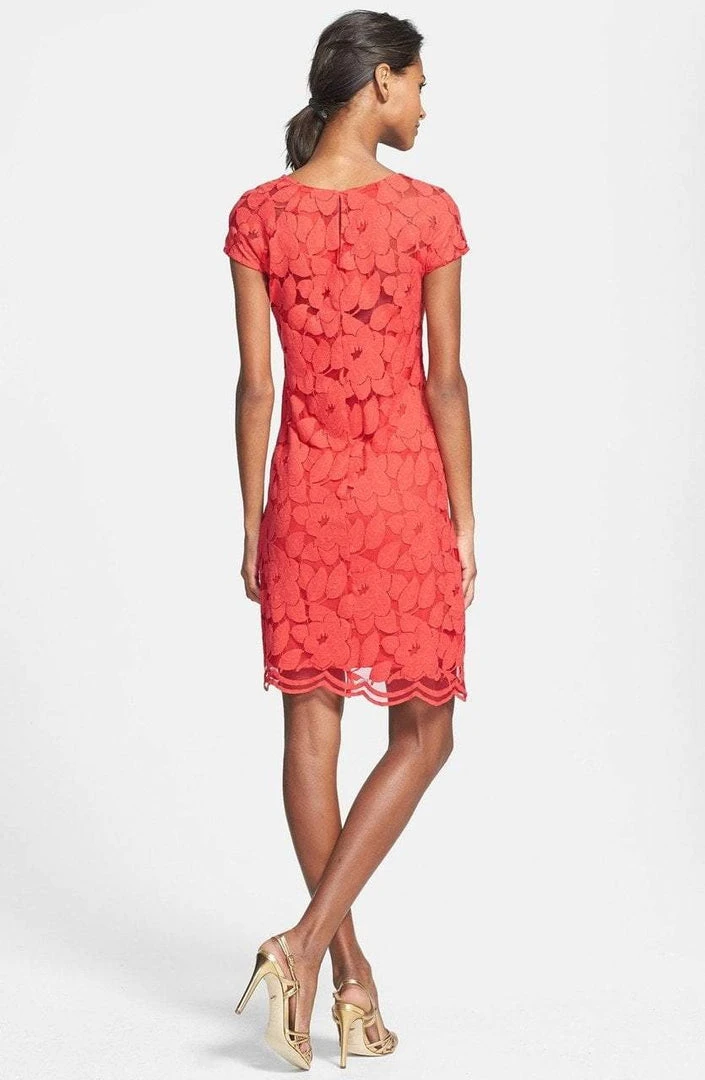 Make them stop and stare in regal elegance in this beautiful Taylor 5448M creation. Overlaid with an intricate floral and leaf patterned lace on a cotton underlining, this attractive piece has a jewel neckline designed with subtle ruching and accented with a triangular keyhole cutout. Framed with sheer cap sleeves and a keyhole cutout on its full back, the sheath skirt flows along every contour with a feminine grace and completes at a scalloped short hemline. Fascinate from all angles with your charming style and poise in this Taylor masterpiece.