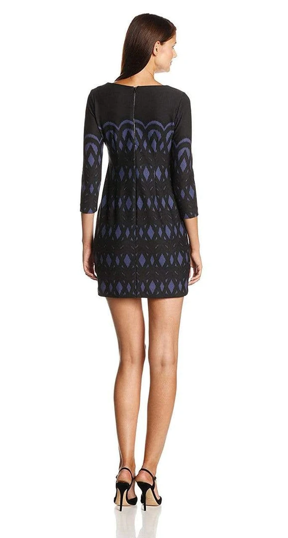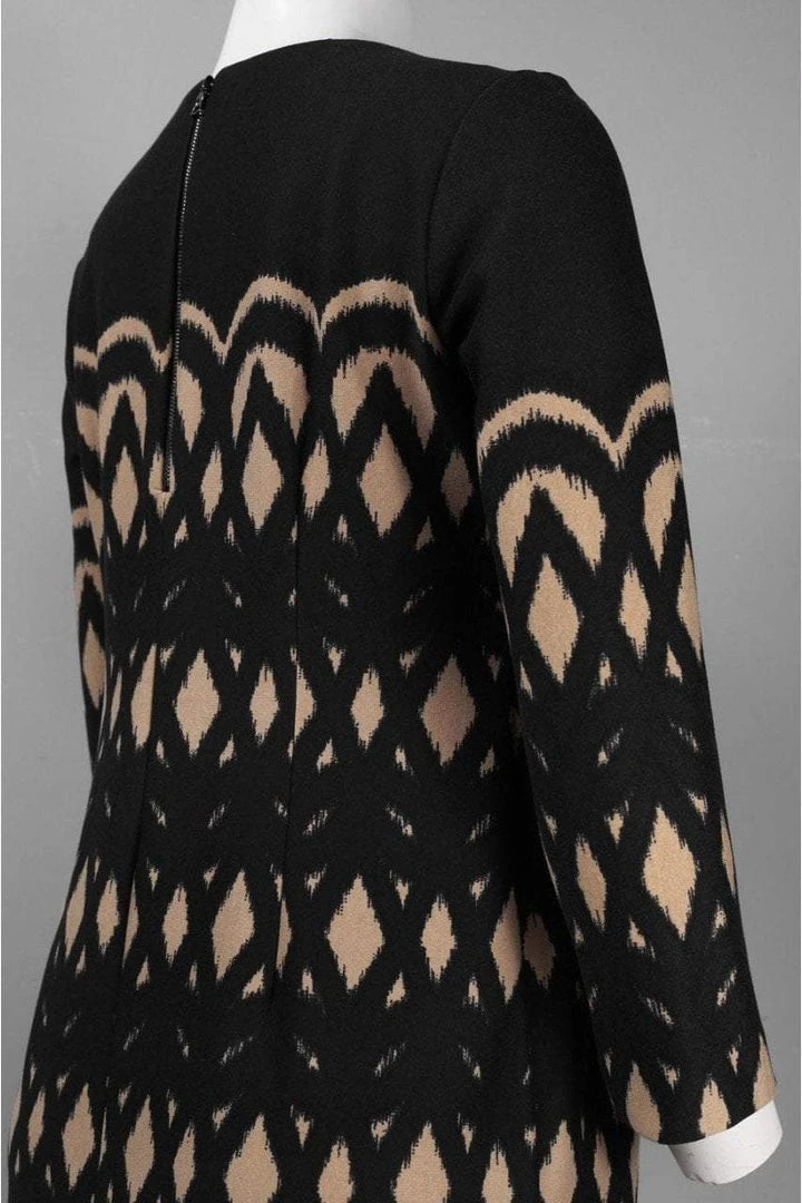 Be a riveting and mesmerizing beauty in this vibrantly printed Taylor 5126M creation. Strikingly printed with a wicker-like pattern on a Ponte fabric, this stunning piece shows a bateau neckline leading to quarter sleeves and a full back with a concealed zipper closure. Sculpting every contour with grace, the sheath skirt skims down to a modest short hem. Pair this fabulously patterned Taylor masterpiece with your favored stilettoes and you????re ready to shine. Model is wearing the Black/Blue color.