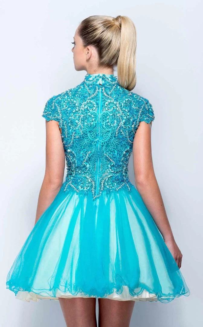 Be ready to sparkle in style in this chic Terani 151P0024 prom creation! This dress charms in its tutu-style skirt, which flares out boldly and features a short, leg-baring design. Up top, the bodice is has a front keyhole and beautifully detailed with patterns of colorful, glimmering sequins and beads stretched all across it. Start your night out right with a stylish Terani dress. Model is wearing Turquoise color.