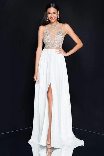 Get an instant attitude in a stylish creation from Terani Couture 1811P5215. This fierce stunner highlights a beaded embellished nude illusion fitted bodice with jewel neckline and strapless frame. The pleated chiffon skirt cascades perfectly to the floor into a wide A-line silhouette with front slit. This Terani Couture creation is breathtakingly stunning and beautiful. Perfect on your next formal event!