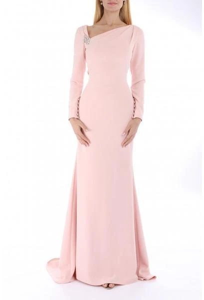 A stylish full length gown featuring asymmetric neckline with brooch accent. The finely pleated shoulders lead to the slender long sleeves with button accent on the cuffs. Sculpted with seam line at the back to draw that figure flattering silhouette, this chic long formal outfit finishes with a mermaid flare and sweep train. Model is wearing Blush color.