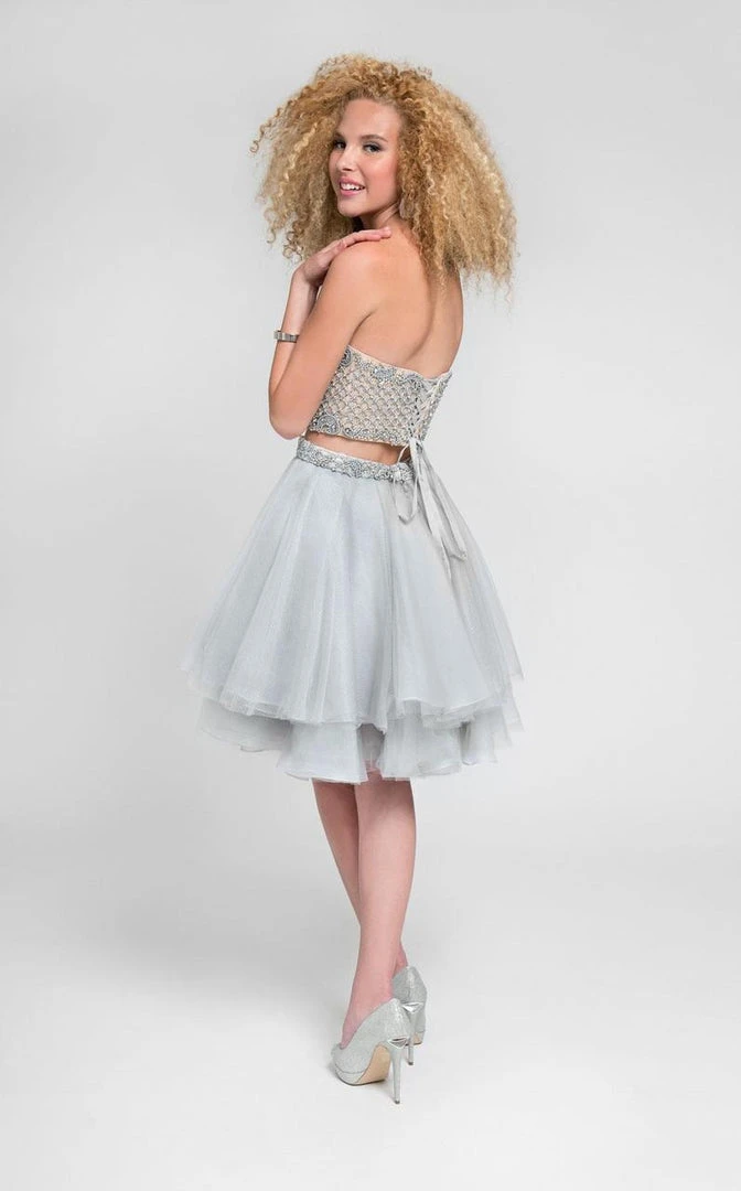 Be dainty, be flirty, be feminine with this Terani Couture Prom 1711P2690. This gorgeous ensemble features an elaborately beaded applique treatment on the strapless crop top bustier and a two-tiered textured tulle party skirt. It also shows a short A-Line hem and a lace-up open back. Have this fascinatingly stunning masterpiece by Terani Couture as your only style option for your next prom or homecoming event.