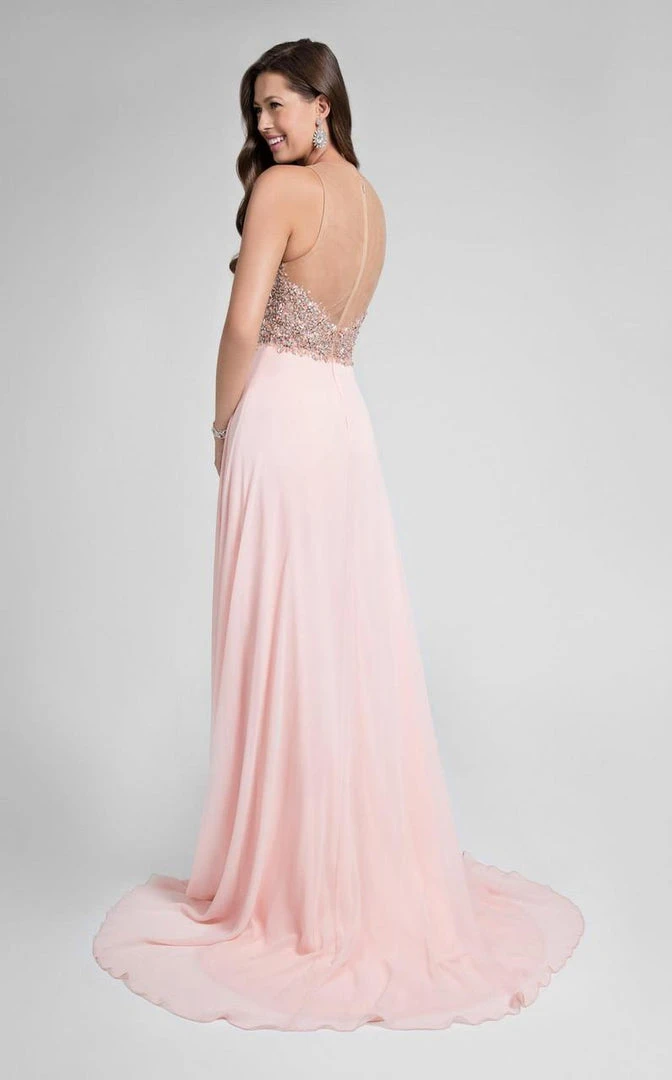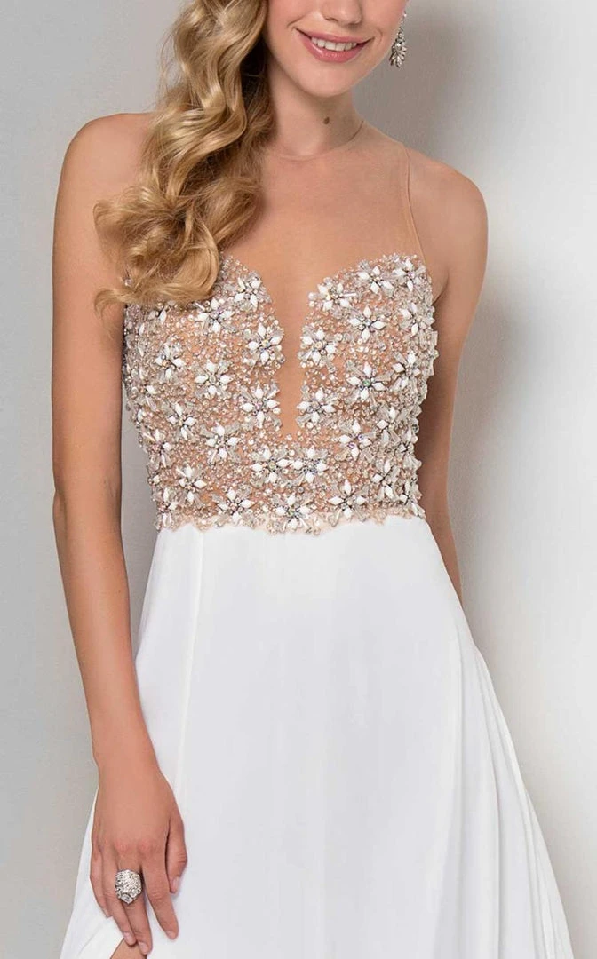 | Details: | High Illusion over a Plunging Sweetheart Neckline, Crystallized Accents on Bodice, Full-Length Hem, Sweep Train, Side Slit |
