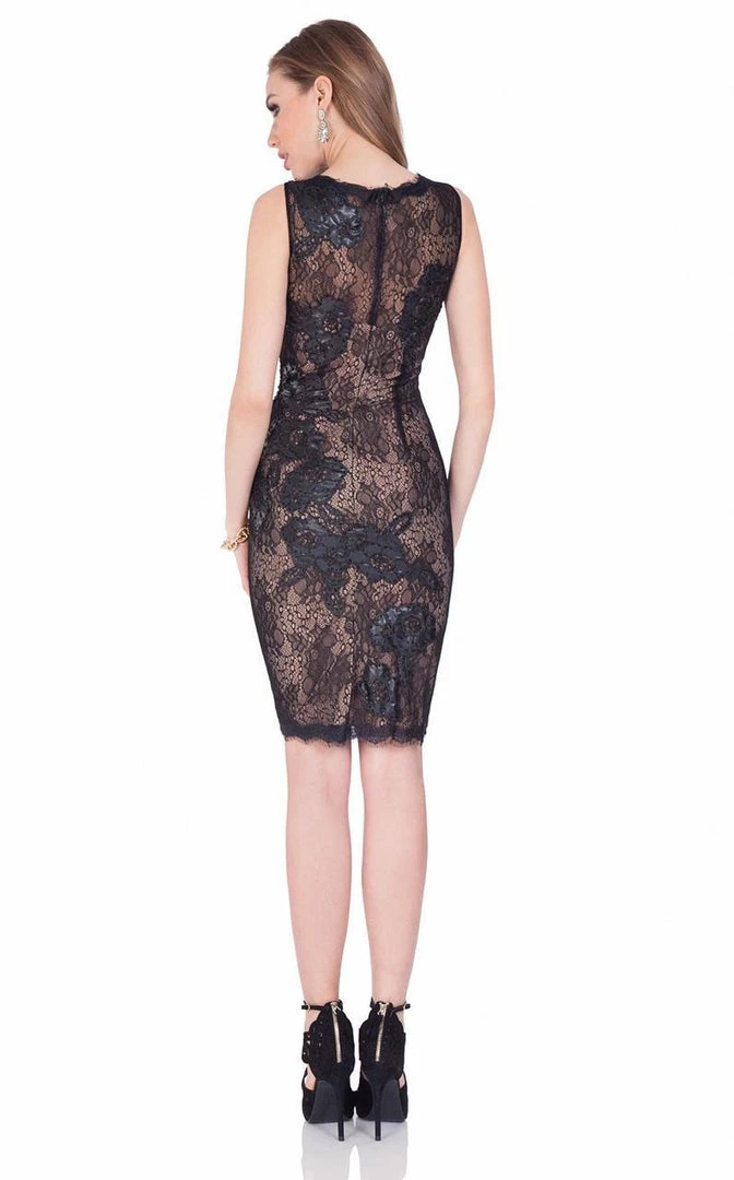 Enter the hall with grace and beauty in Terani Couture 1623C1411. Attractive lace and leather cocktail dress. Elaborate leather appliques complement this sleeveless style. Make it a romantic occasion with this dress by Terani Couture.