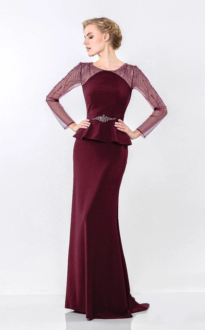 Flourish feminine grace and sophisticated style at any party in this sleek Terani Couture Evening 1522M0655B creation. Parading rhinestones trailing the sheer bodice and long sleeves, this delicate piece features a bateau illusion over a curved neckline and an ornate mesh full back. Flaunting a ruffled peplum skirt detail topped by a beaded waistband, the crepe sheath skirt flows divinely at a full-length hem and completes with a sweep train. Be a regal vision in this magnificent Terani Couture masterpiece. Model is wearing the Navy and Wine colors.