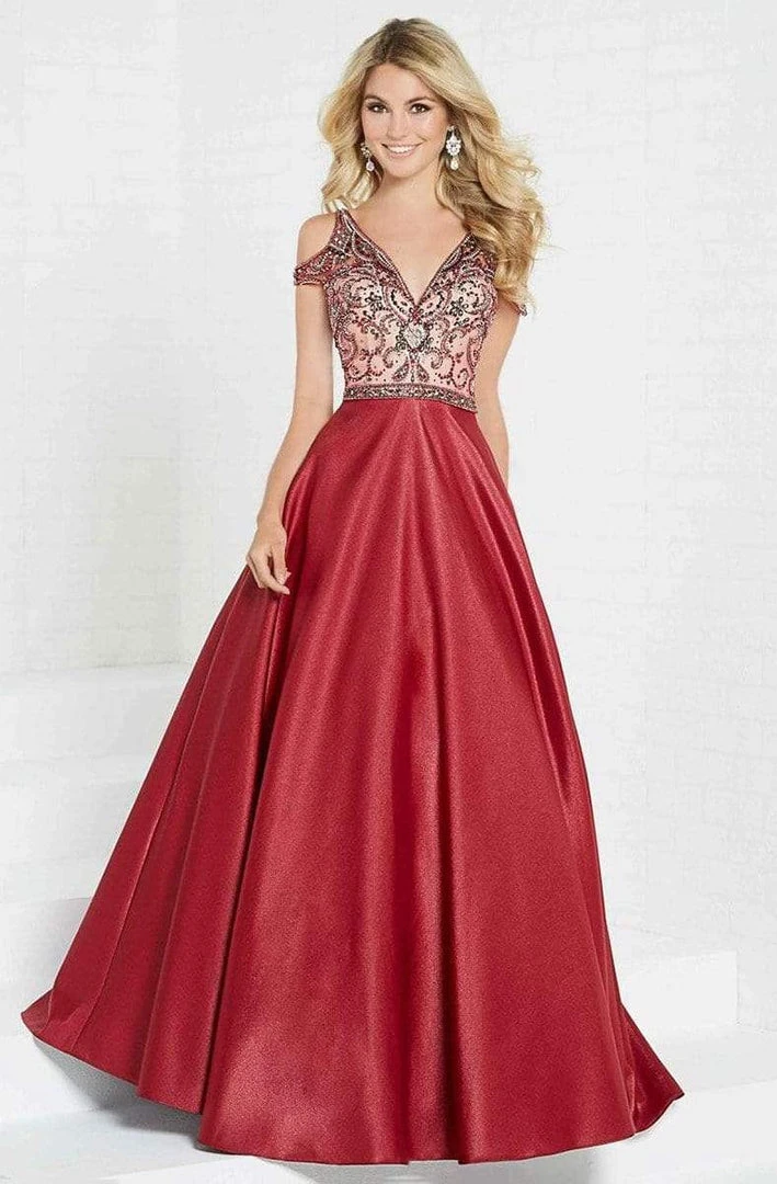 Feel like a princess at you next event in this elegant gown by Tiffany Designs 16283. Glimmering beadwork sparkles in the light along the v-neckline and cold shoulder. A deep v-back gives the dress an attractive appeal. A flowy shimmer satin skirt flows out from your waist, accentuating your beauty, and comes equipped with side pockets, center zipper, and sweep train. Wear this Tiffany Designs gown and you will feel all royal and radiant looking