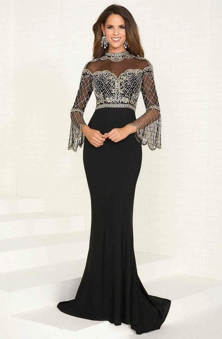 Live in the Golden Age of true glamour with this evening gown by Tiffany Designs 16285. This dress has dramatic bell sleeves with a high neckline and ornate sequined details throughout. The bodice is fitted and the skirt boasts a slight flared shape with a full-length hem. Open back has a train trails at back with center zipper. Glitter for the special occasion in Tiffany Design.